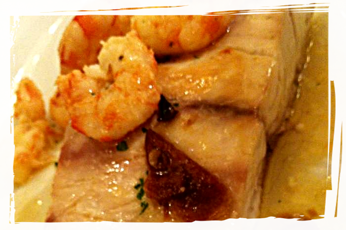 Preparar el pescado en dos filetes,  machacar el ajo y lo aplicamos al pescado, sal pimentamos y ponemos al horno a 200 grados, por 20 minutos, mientras tanto en un sartén, sofreír la cebolla y el tomate, hasta pochar, agregar el vino, dejar evaporar alcohol, poner las gambas y cocinar por 5 minutos y reservar . Al sacar el pescado del horno proceder a cubrir con la salsa de camarones y servir.