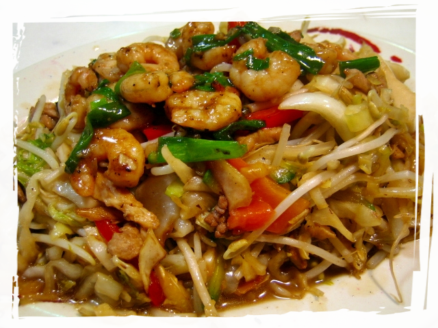 Comenzar por lavar, pelar todas las verduras y cortar en tiras finas.En una cazuela o wok poner las cuatro cucharaditas de aceite de oliva virgen e ir añadiendo las verduras (sin los brotes de soja).Cuando estén al dente y con todo su color, añadir los brotes de soja, un vaso de agua y salsa de soja, cocinar durante unos 5 minutos, añadir las gambas peladas y seguir cociendo 5 minutos más.