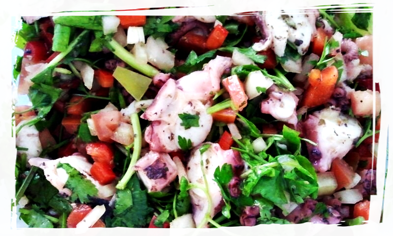 Tomamos el pulpo y lo echamos al agua hirviendo, al momento de echarlo al agua lo asustamos tres veces (metemos y lo sacamos tres veces), de esa forma veremos cómo se encoje (se asusta). Lo dejamos cocer ya dependiendo el tamaño. En el caso de un pulpo mediano (1.5 Kgs) unos 30 minutos serán suficientes, más de 1.5 Kgs 45 minutos, cortar la cebolla, los pimentones en cuadritos y el cilantro colocar en un Bowl, filetear el pulpo ya cocido, colocar en el bowl, aderezar con vinagre de jerez, aceite de oliva, oregano, sal y pimienta; revolver y servir.
