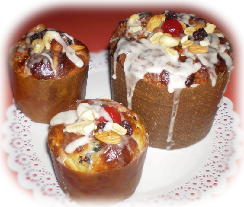 Antes de meterlo al horno los pintamos cada pan dulce con una yema apenas batida con leche y esparcimos con frutos secos por la superficie del pan dulce. Lo metemos al horno a 180º C de 15-20 min, en cocción al vapor (poner fuente con agua en el piso del horno) hasta que se dore por encima y esté cocido por dentro o hacemos la prueba del palillo (insertamos un palillo y si éste sale seco está listo)