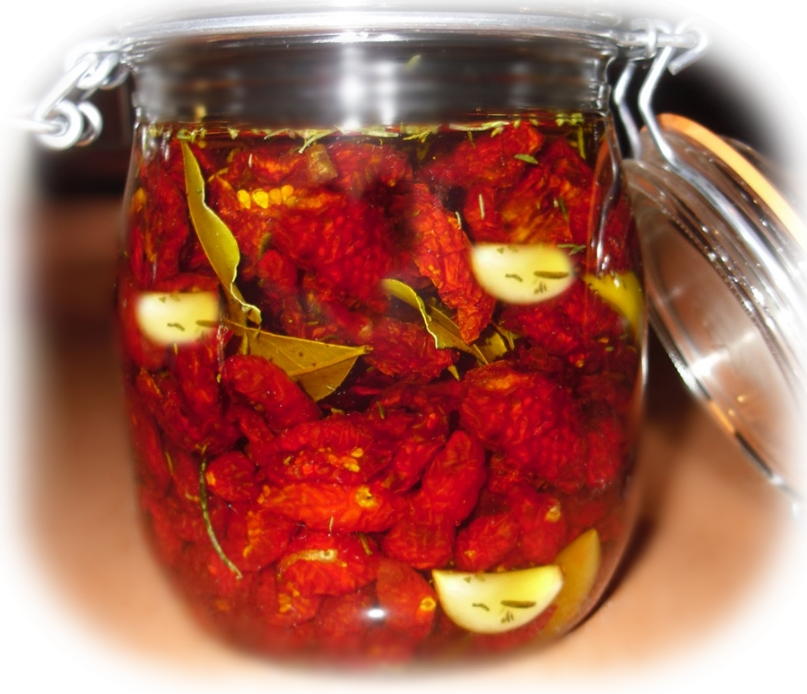 Sacamos del horno y luego lo metemos dentro de un frasco de vidrio esterilizado y le agregamos laminas de ajo, más orégano, laurel, romero y llenamos con aceite de oliva hasta cubrir todos los tomates,  de esta forma el tomate se conserva por bastante tiempo y mantiene intacto su sabor