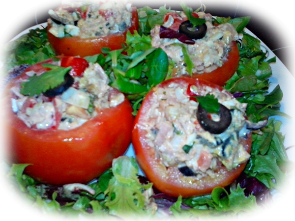 En un bowl mezclamos el atún, la pulpa de los tomates, la cebolla, el huevo, las aceitunas, los pepinillos, el pimentón rojo, el puerro, el cilantro, la pizca de sal, el zumo de limón, la mostaza y la mahonesa. Luego rellenamos los tomates con la mezcla. Y Listo!!!